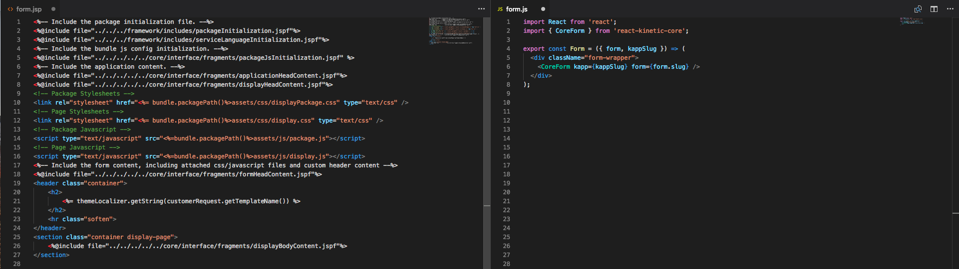 Here’s an example of some code from our old JSP’s compared to how it looks now in React; React is on the right