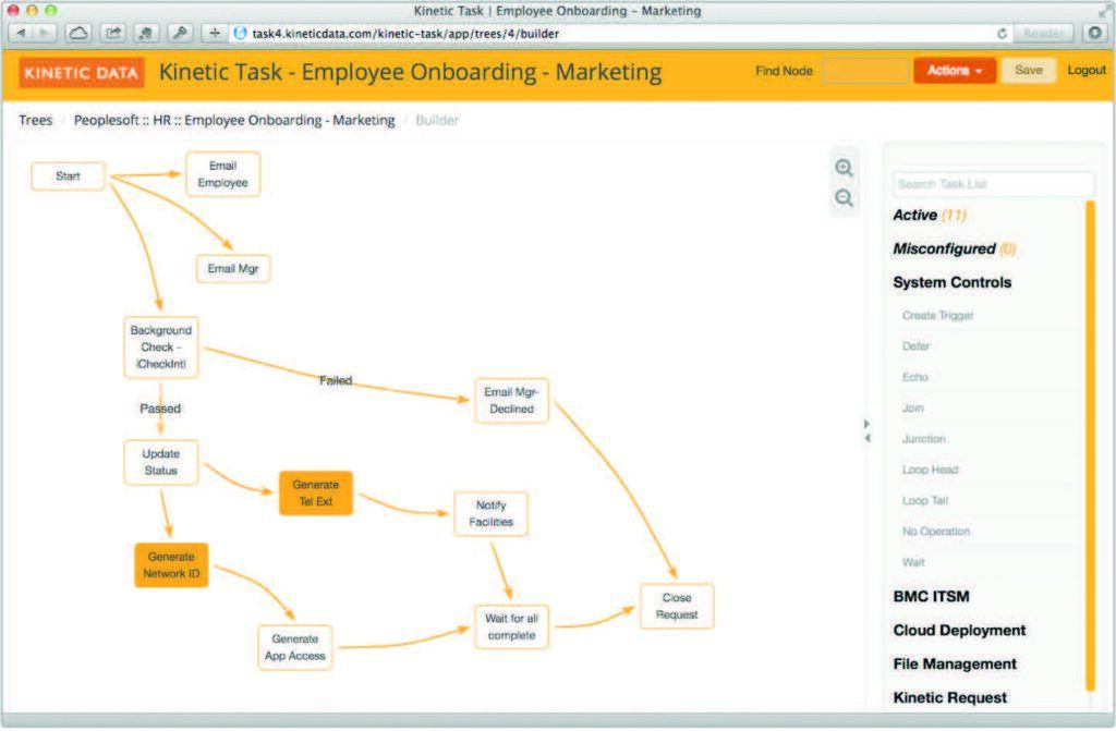 Kinetic Task features an intuitive interface, the Kinetic Task Builder, which is designed to allow a nontechnical person to effectively build services. The builder allows drag-and-drop configuration of services integrated in an end-to-end approach geared towards iterative improvement.