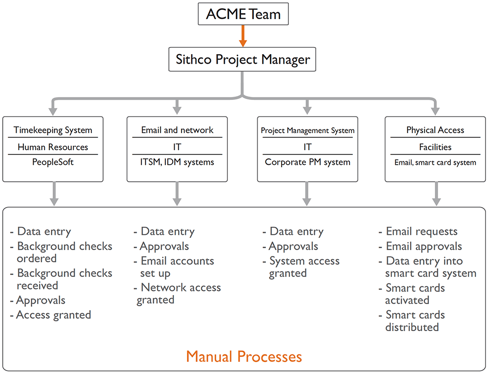Hidden Complexity in “Straightforward Processes”Assuming that all security clearances and approvals are completed prior to the project start date, the ACME team will begin the project on time and be productive while adhering to the security policies Sithco has in place. Is this effective? Possibly. Is it efficient? Probably not. Sithco has invested energy into reducing risk and ensuring that access to systems, facilities, and data is governed in line with corporate and legal requirements. From the perspective of each of the shared services groups (HR, facilities, IT, etc.), these access control processes seem straightforward. However, they are more complex when viewed from the vantage point of the enterprise. In the scenario described above, when the project begins, the Sithco manager overseeing the implementation needs to ensure that every member of the project team has been granted the appropriate access rights, or else they may face lost productivity and project delays. The provision of both physical and IAM access is broken into disparate fulfillment steps across multiple back-end systems, people, and processes. Specifically, the project security access process entails multiple service requests to fulfillment groups (HR, facilities, IT, etc.) and input of data into multiple systems, along with manual steps (e.g., facilities responding to email requests for smart card access and HR ensuring that background checks are executed properly by a third-party provider).