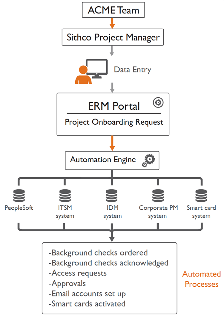 Employing an ERM approach would not only reduce risk and security exposure for Sithco, but would also improve corporate efficiency by utilizing a centrally governed access management framework. Upon contract approval, The Sithco project manager would navigate to the project onboarding request screen on the ERM portal. He or she would input the data relevant to the project, and the system would then automatically coordinate all of the security-access-provisioning steps, including notifications, approvals, and status updates. In this approach, once the data is entered up front—one time, in one place—the defined enterprise delivery model is automated end-to-end, including orchestration of all the existing access-control steps in departmental fulfillment systems. Centralizing this process at the enterprise level not only reduces risk by creating a true end-to-end access governance model, but also allows for key shared service groups to manage and maintain their specific fulfillment models in a distributed manner. The result is not only a more effective process, but also a more efficient one.