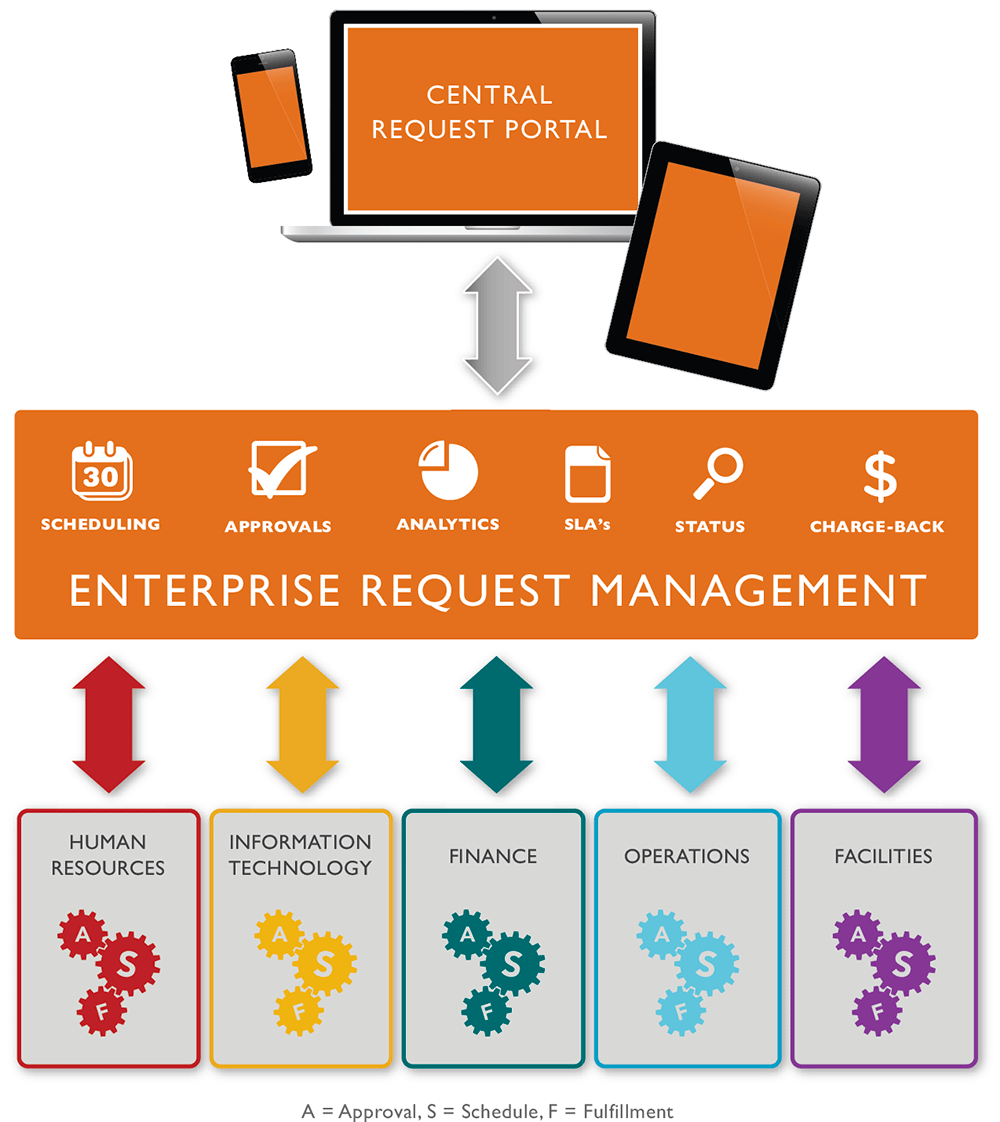 Enterprise request management (ERM) is a service delivery strategy that offers fully integrated business process automation, delivered in a customer-centric user interface and employing an integrated back-end delivery model. The goal of an ERM strategy is to allow business service providers to meet enterprise service delivery requirements for shared-service environments in a scalable, cost-effective manner. In this collaborative approach, a single, easy-to-use request portal (a.k.a. a system of engagement) replaces the hodgepodge of emails, phone calls and disparate department online requests form front-ends. And an automated task management “backbone” application eliminates siloed functions and manual processes by automatically managing approvals, scheduling, and fulfillment through secure communications with and between departmental software platforms (systems of record).
