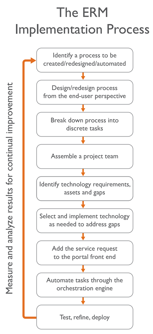 IT service desks are often overburdened with calls. Look at the metrics you are (hopefully) already collecting and categorize the calls you are receiving. Are most of them for password resets? Or are users having problems with software installs? Use your online self service portal to allow users to log and track common service requests themselves. That’s an example of a narrow and shallow ERM process—it focuses on one specific need in one specific area and a relatively easy way to resolve it. With a service request portal and a back-end process automation engine, ERM allows you to meet such simple needs easily. And with a flexible and extensible design, ERM allows you to add more and different types of requests over time. A key concept of ERM is using process workflow automation software to orchestrate back-end systems of records in many different departments or functions. This makes it easy to evolve from narrow and shallow to wide and deep processes, automating complex requests that may span multiple parts of the enterprise, using lessons learned from earlier and simpler types of request fulfillment. New employee onboarding is a common example. Before one large enterprise implemented ERM, the company had a partially automated onboarding process that started with a cumbersome 60-question online form. Completing that form resulted in an email to the service desk, which then had to manually send out tickets to multiple departments. Creating the tickets alone took roughly four hours per request. Since the company was hiring more than 200 new employees each month, the time and cost were enormous. Drawing on lessons learned from successfully automating simpler self-service requests, the company was able to use a self-service portal to orchestrate and automate most of the ticketing activity and reduce the time to process each request from four hours to just minutes. Most importantly, the process was designed from the new employee’s perspective. Employees started work with everything they needed from day one, including office space, computers and phones, system access and passwords, personalized training plans, security badges, and parking spaces. This was an example of a request that the company was passionate about—it wanted to reduce the stress of those first few days on the job as much as possible—and that previously entailed a great deal of pain since new employees sometimes had to wait days before they were even minimally provisioned to do their jobs. It’s also an example of a great ERM strategy: Start small, demonstrate value with early wins, generate organizational support, and then move on to the next pain point until eventually your ERM implementation becomes wide and deep. ## How to start